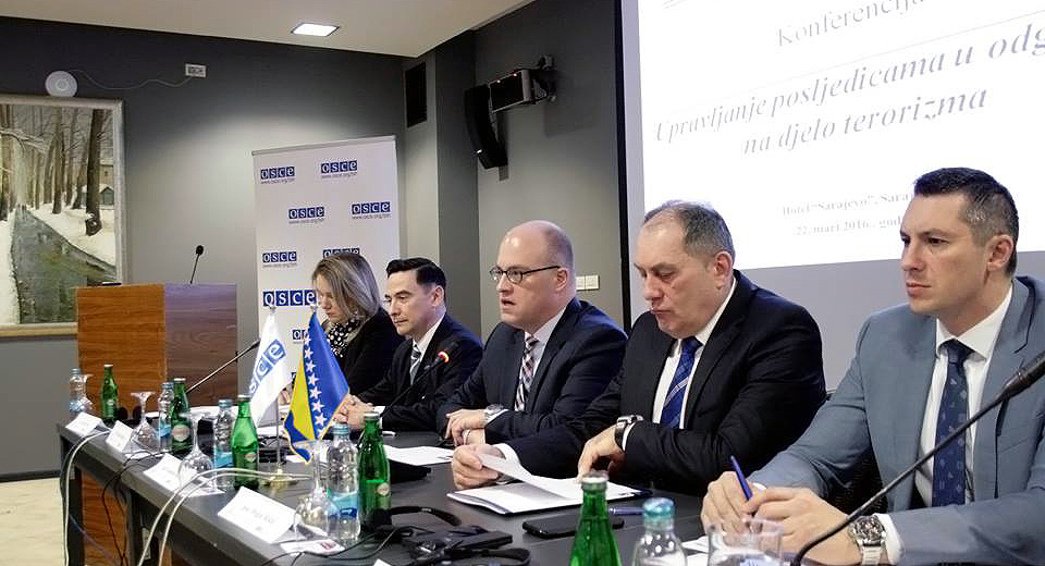 Head of the OSCE Mission to Bosnia and Herzegovina, Jonathan Moore and Minister of Security of BiH, Dragan Mektic address participants at the Consequence Management in Response to an Act of Terrorism Conference in Sarajevo.