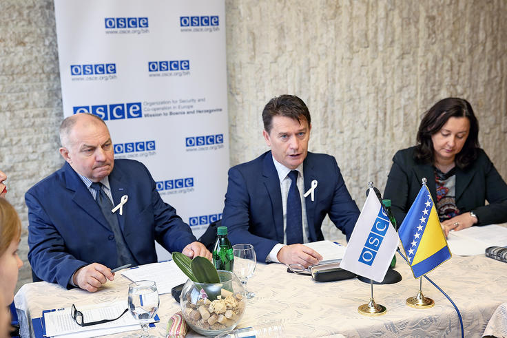 Zamjenik šefa Misije OSCE-a u Bosni i Hercegovini, Alexander Chuplygin (l), zamjenik ministra sigurnosti BiH, Mijo Krešić (s) i brigadirka u Oružanim snagama Bosne i Hercegovine, Mersida Mešetović na Naprednom kursu u oblasti sigurnosne politike za bh. zvaničnike i zvaničnicе; Tuzla, 30. novembar 2016.