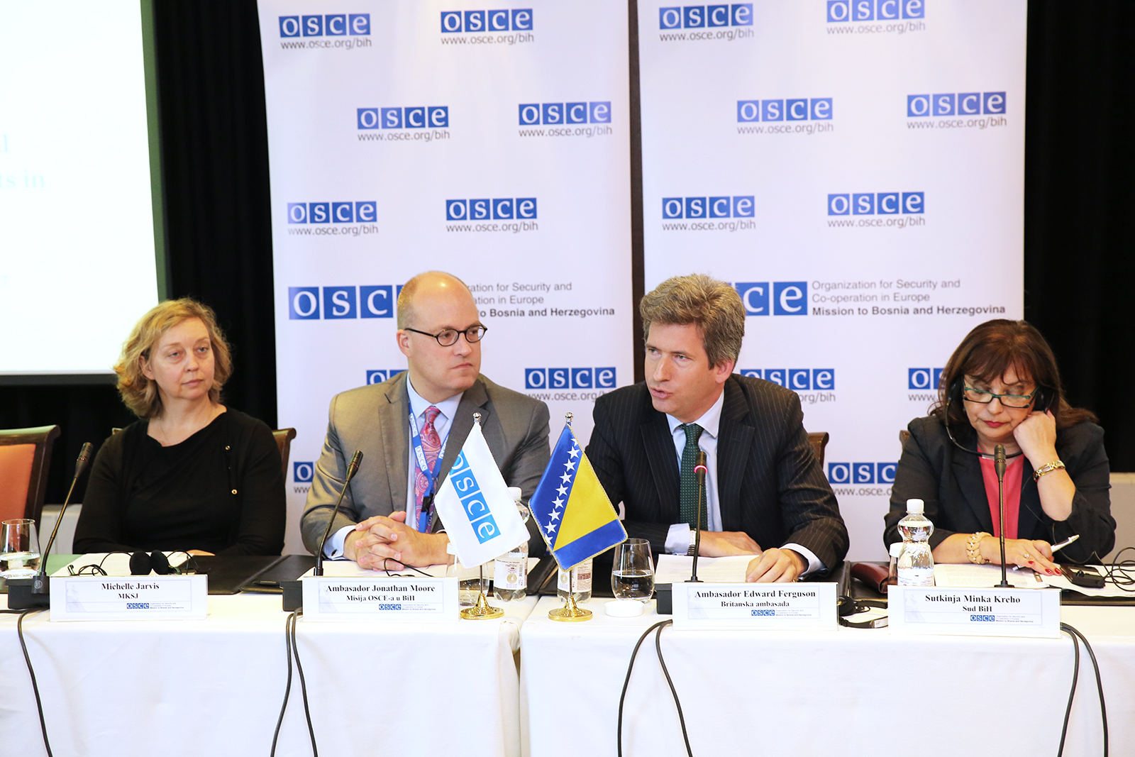 (L-D) Michelle Jarvis, zamjenica tužioca u Međunarodnom krivičnom sudu za bivšu Jugoslaviju, ambassador Jonathan Moore, šef Misije OSCE-a u Bosni i Hercegovini (BiH), Edward Ferguson, britanski ambasador u BiH i Minka Kreho, sutkinja Suda BiH, na predstavljanju izvještaja 'Postizanje pravde za žrtve seksualnog nasilja u oružanom sukobu u Bosni i Hercegovini: Napredak ostvaren pred sudovima u BiH od 2014. do 2016. godine', Sarajevo, 21 juni 2017. godine