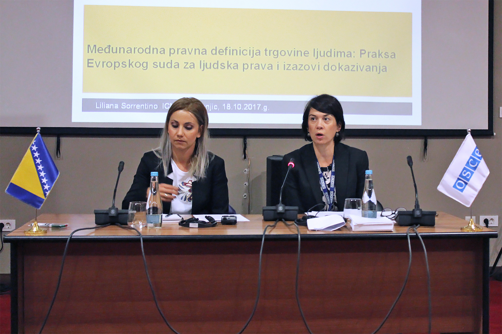 Zamjenica šefa u Odjelu za ljudsku dimenziju Misije OSCE-a u Bosni i Hercegovini, Jasna Dobričik (desno, perspektiva gledaoca) prilikom obraćanja prisutnima na obuci za tužioce i sudije u Bosni i Hercegovini o ulozi informacionih tehnologija u trgovini ljudima, Konjic, 18. oktobar 2017. godine