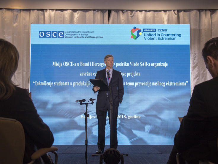 Šef Misije OSCE-a u Bosni i Hercegovini, Bruce G. Berton na ceremoniji proglašenja pobjednika/ca OSCE-ovog takmičenja studenata u produkciji dramske predstave na temu prevencije nasilnog ekstremizma; Sarajevo, 13. mart 2018. godine