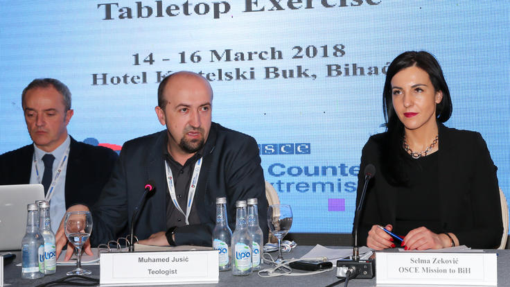Vršilac dužnosti šefa sigurnosne saradnje u Misiji OSCE-a u Bosni i Hercegovini Selma Zeković (d) i islamski teolog i publicista Muhamed Jusić (l) na OSCE-ovoj praktičnoj radionici u oblasti borbe protiv nasilnog ekstremizma, Bihać, 15. marta 2018. godine