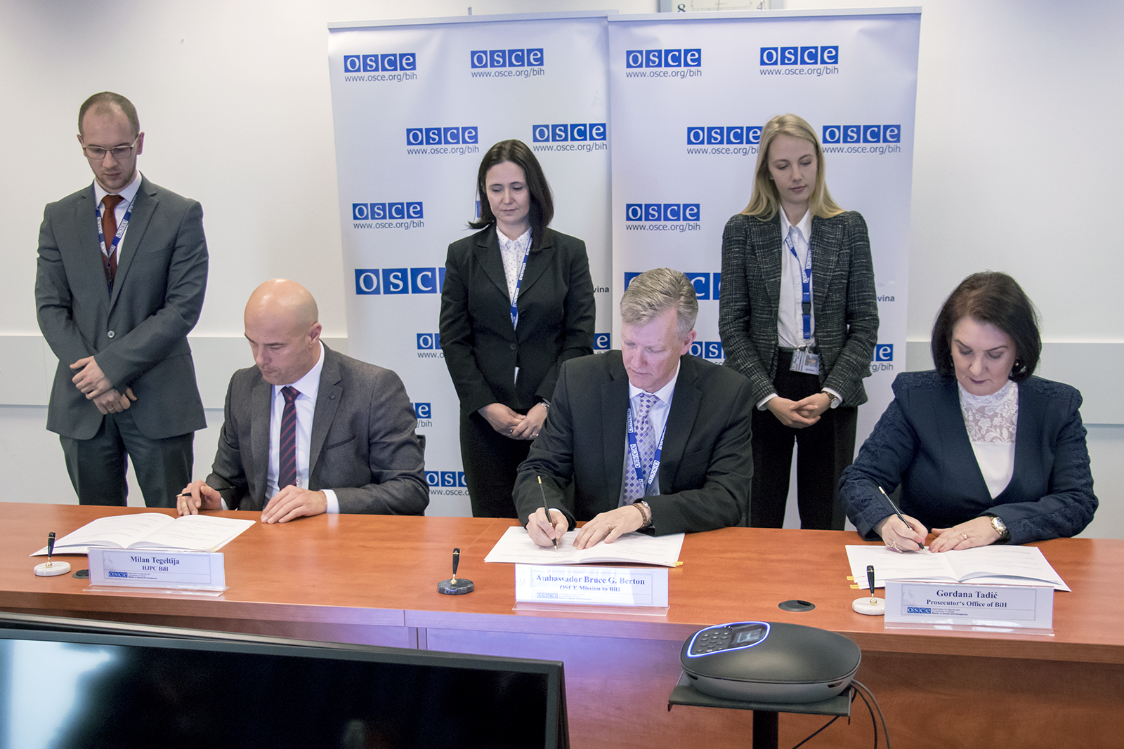 (L-D) Predsjednik Visokog sudskog i tužilačkog vijeća Bosne i Hercegovine, Milan Tegeltija, šef Misije OSCE-a u Bosni i Hercegovini (BiH), ambasador Bruce G. Berton i glavna tužiteljica Tužilaštva BiH, Gordana Tadić na svečanosti potpisivanja memoranduma o saradnji o razvoju digitalne arhive dokaza vezanih za ratne zločine u posjedu Tužilaštva BiH; Sarajevo, 22. februar 2019. godine
