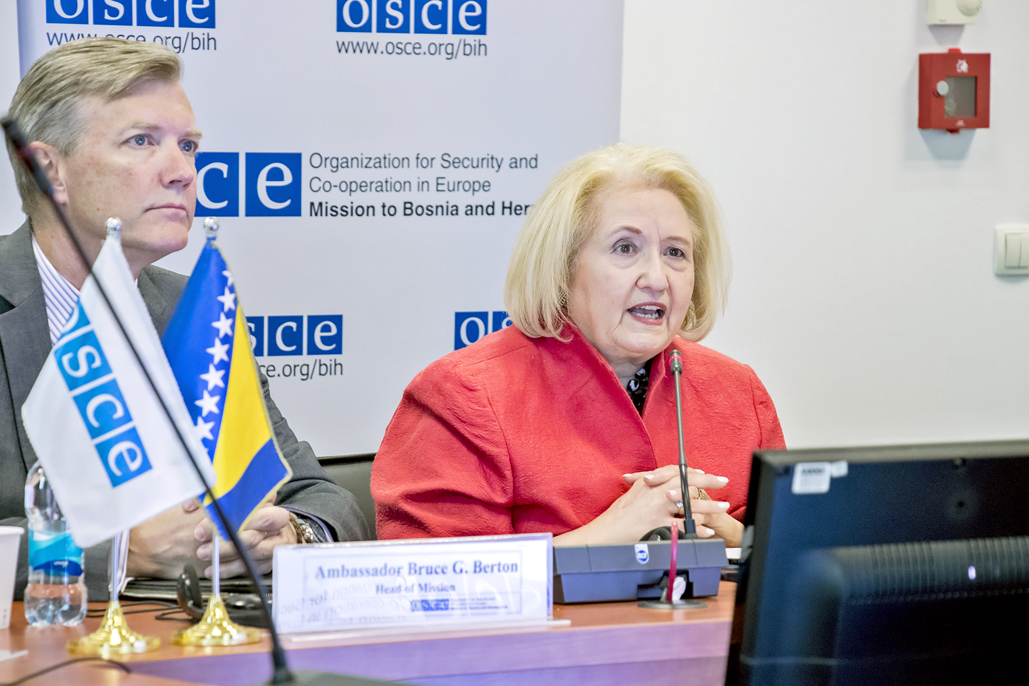 (L-D) Šef Misije OSCE-a u Bosni i Hercegovini, ambasador Bruce G. Berton i specijalna predstavnica predsjedavajućeg OSCE-a za pitanja rodne ravnopravnosti, ambasadorica Melanne Verveer, na konferenciji za medije u Sarajevu, 9. maja 2019. godine