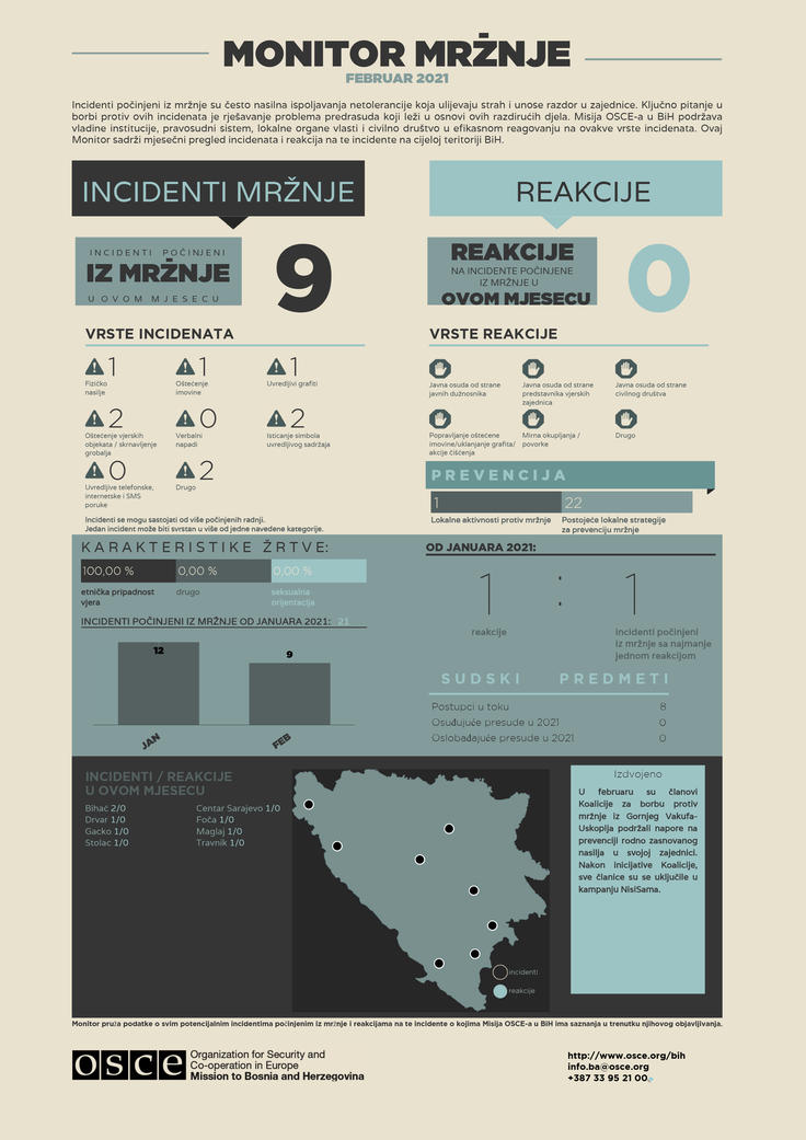 Incidenti počinjeni iz mržnje su često nasilna ispoljavanja netolerancije koja ulijevaju strah i unose razdor u zajednice. Ključno u borbi protiv incidenata počinjenih iz mržnje je suočavanje sa problemom predrasuda, prisutnom u osnovi ovih razdirućih djela. Misija OSCE-a u Bosni i Hercegovini (BiH) podržava vladine institucije, pravosudni sistem, lokalne organe vlasti i civilno društvo u efikasnom reagovanju na ovakve vrste incidenata. Izvještaj sadrži mjesečni pregled incidenata na teritoriji BiH i reakcija javnosti na zabilježene incidente