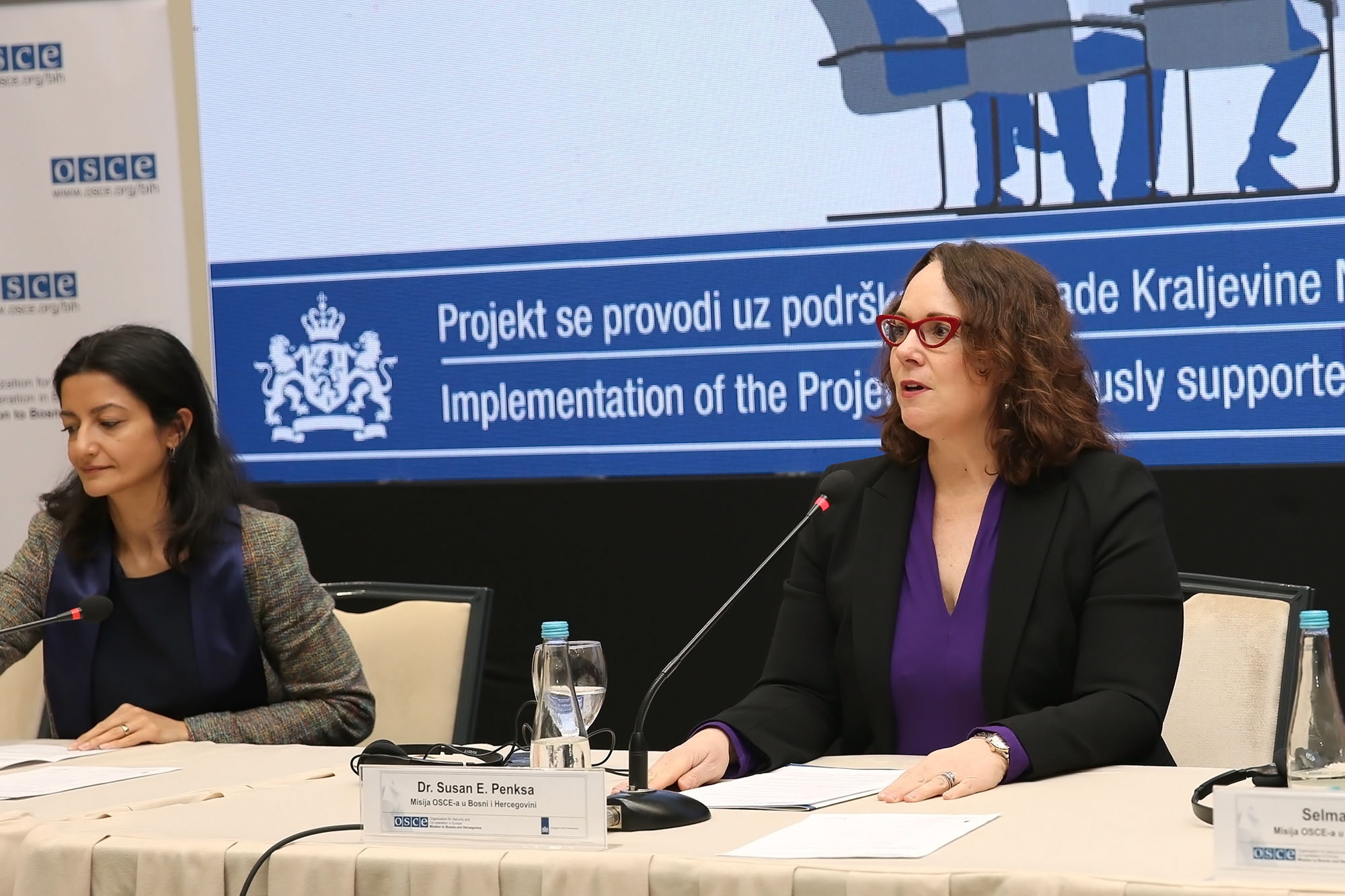 Mina Noor, zamjenica ambasadora Kraljevine Holandije u Bosni i Hercegovini (lijevo) i šefica Odjela za sigurnosnu saradnju Misije OSCE-a u Bosni i Hercegovini, dr. Susan Penksa (desno) na "praktičnoj vježbi na temu sprečavanja i suzbijanja nasilnog ekstremizma i radikalizacije koja vodi terorizmu“, održane u organizaciji OSCE-a; Sarajevo 9-10. 03. 2022. godine