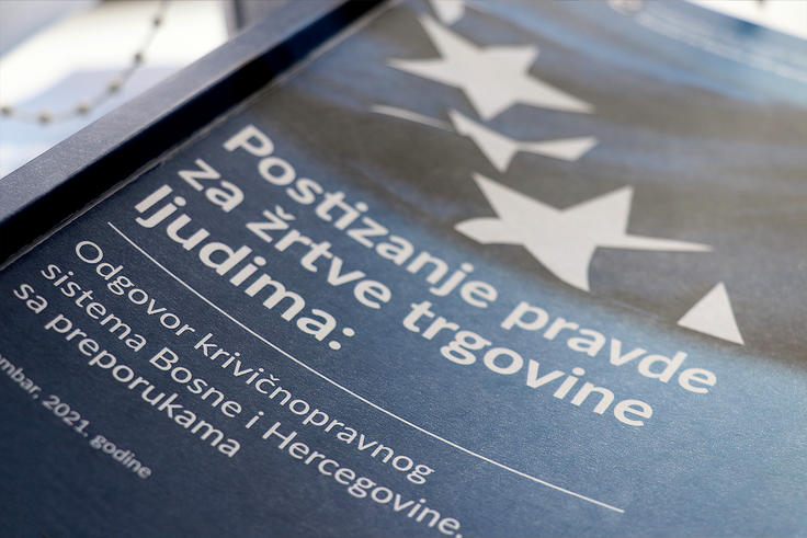 "Postizanje pravde za žrtve trgovine ljudima: Odgovor krivičnopravnog sistema Bosne i Hercegovine, sa preporukama", naslovnica izvještaja