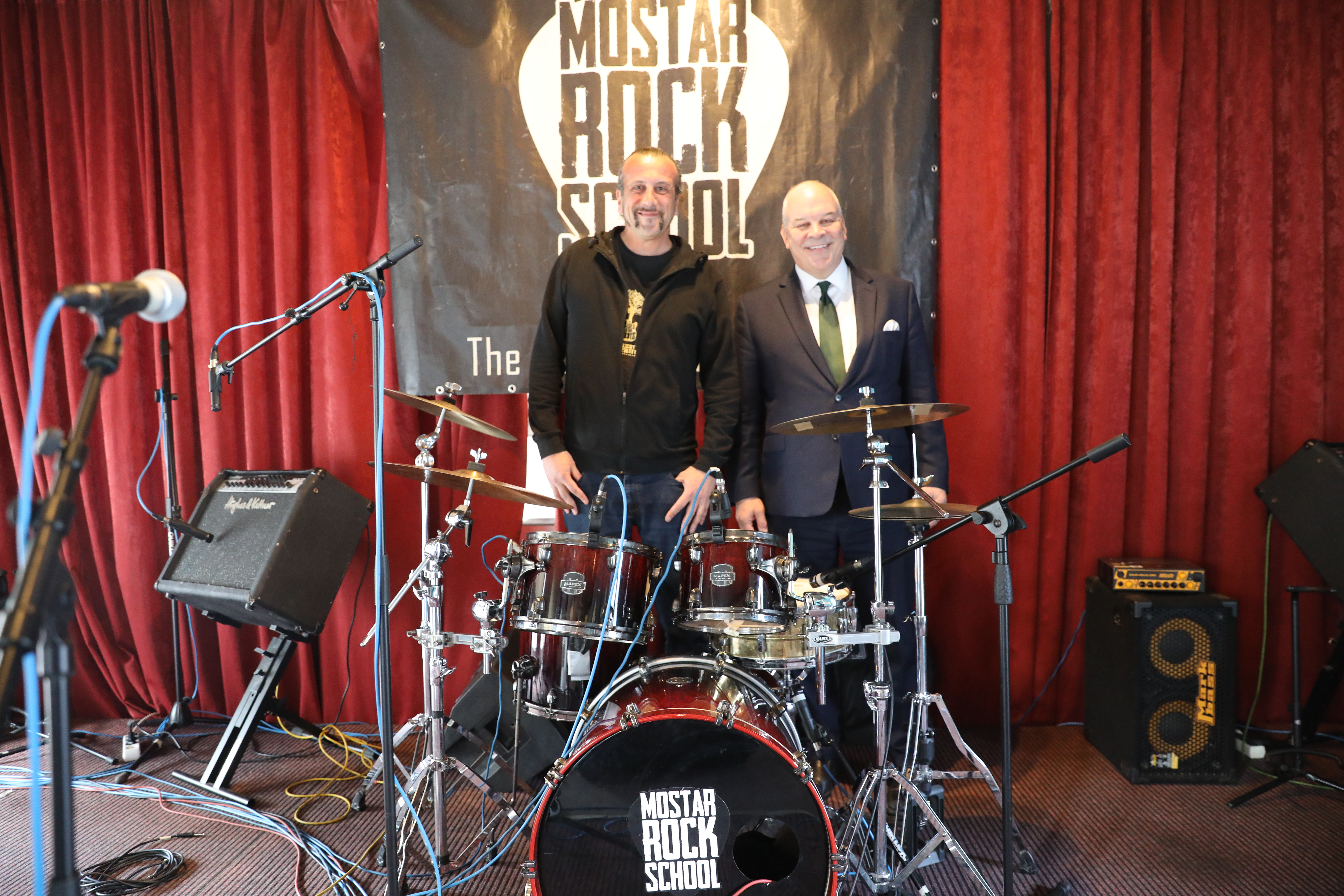 Tokom posjete Mostaru, ambasador Aggeler se susreo sa Orhanom Maslom, osnivačem i direktorom Mostar Rock škole. Mostar, 12. april 2023. godine
