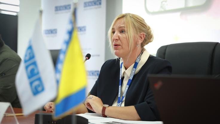 Sabrina Schirmer, šefica Terenskog ureda Brčko pri Misiji OSCE-a u BiH, se obraća učesnicima naglašavajući da će projektom biti uspostavljeni mehanizmi za sprečavanje nasilja putem interneta kojem su izložena djeca školskog uzrasta i za podizanje svijesti među mladima o tom problemu. BRČKO, 22. maj 2023. godine