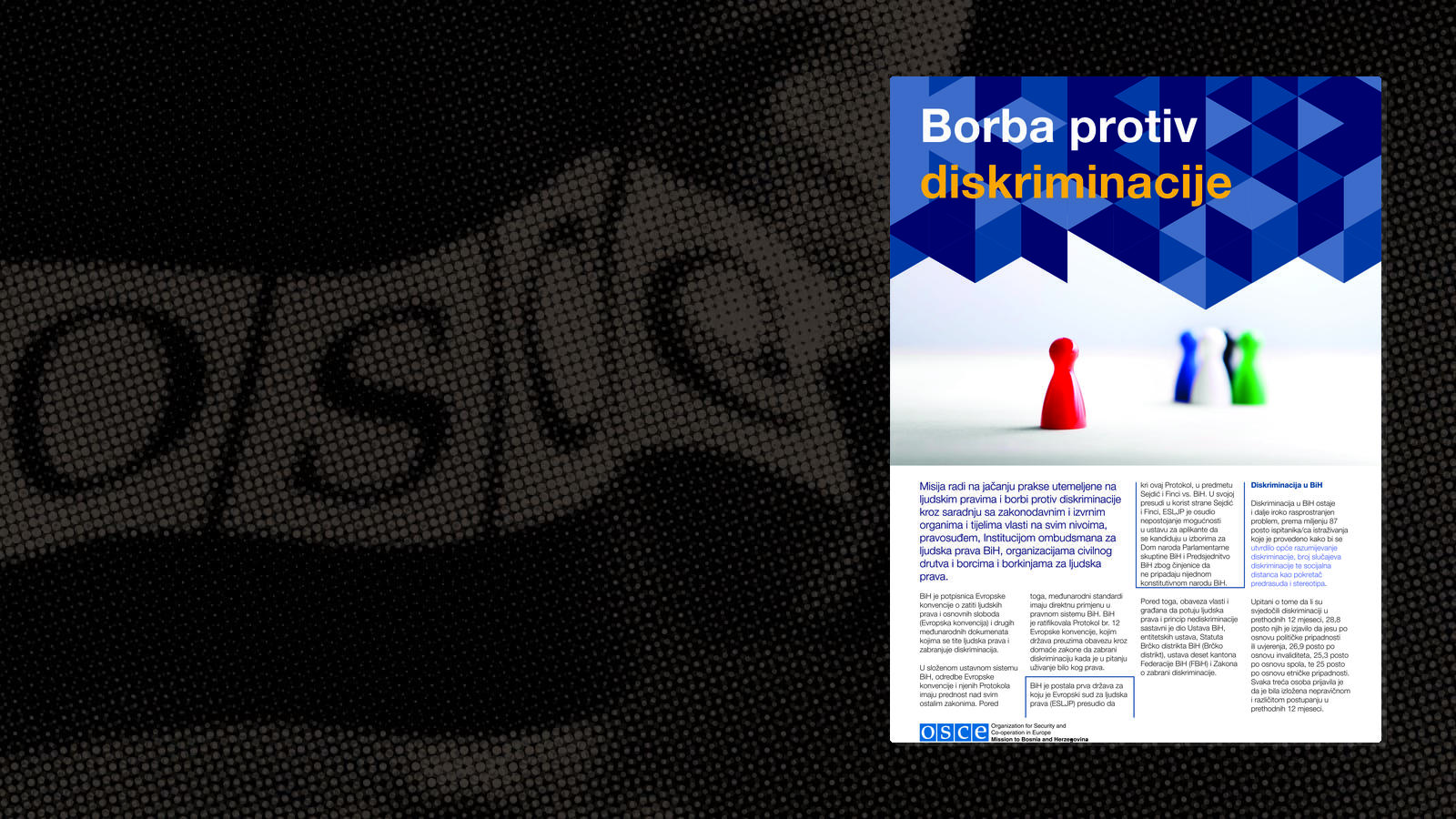 Misija OSCE-a u Bosni i Hercegovini radi na jačanju praksi i standarda zasnovanih na ljudskim pravima za borbu protiv diskriminacije sarađujući sa zakonodavnim, pravosudnim i vladinim institucijama na svim nivoima vlasti, kao i sa Institucijom ombudsmena/ombudsmana za ljudska prava Bosne i Hercegovine, organizacijama civilnog društva i braniteljima ljudskih prava.