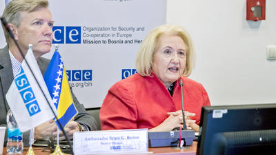 Šef Misije OSCE-a u BiH, ambasador Bruce G. Berton, se detaljnije osvrnuo na napredak koji je država ostvarila od prošle posjete ambasadorke Verveer 2016. godine. „Nekoliko je svijetlih tačaka na horizontu: naprimjer, usvajanje novih zakona na državnom i entitetskom nivou koji se bave pitanjima kao što su diskriminacija i nasilje u porodici“, rekao je Berton. „Međutim, ti zakoni nisu uvijek praćeni njihovom provedbom, obzirom da sadašnji politički zastoj[ZS1] predstavlja značajnu prepreku napretku“, dodao je.