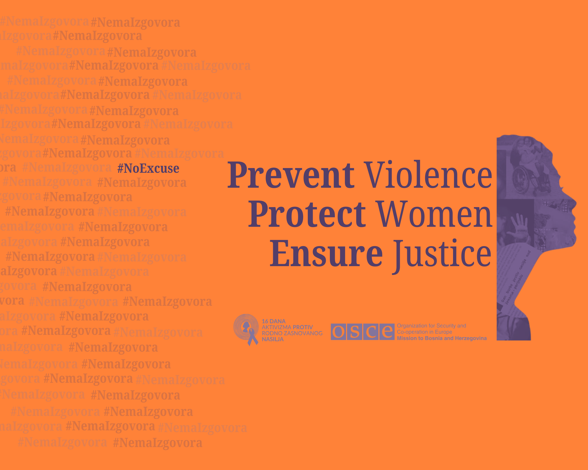 Orange graphic with text: "Prevent Violence, Protect Women, Ensure Justice." Features a purple silhouette of a woman.