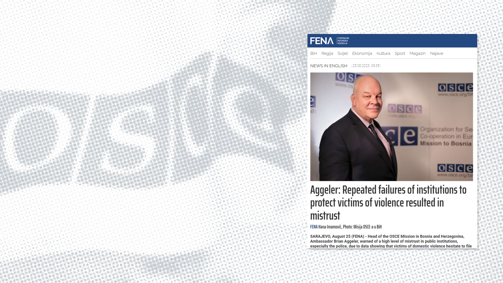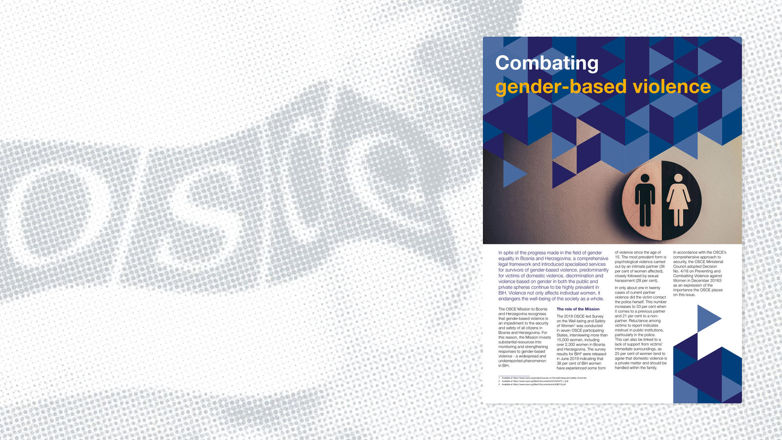 The OSCE Mission to Bosnia and Herzegovina recognizes that gender-based violence is an impediment to the security and safety of all citizens in BiH. The Mission prioritizes efforts to strengthen institutional response to gender-based violence in BiH - a widespread and underreported phenomenon.