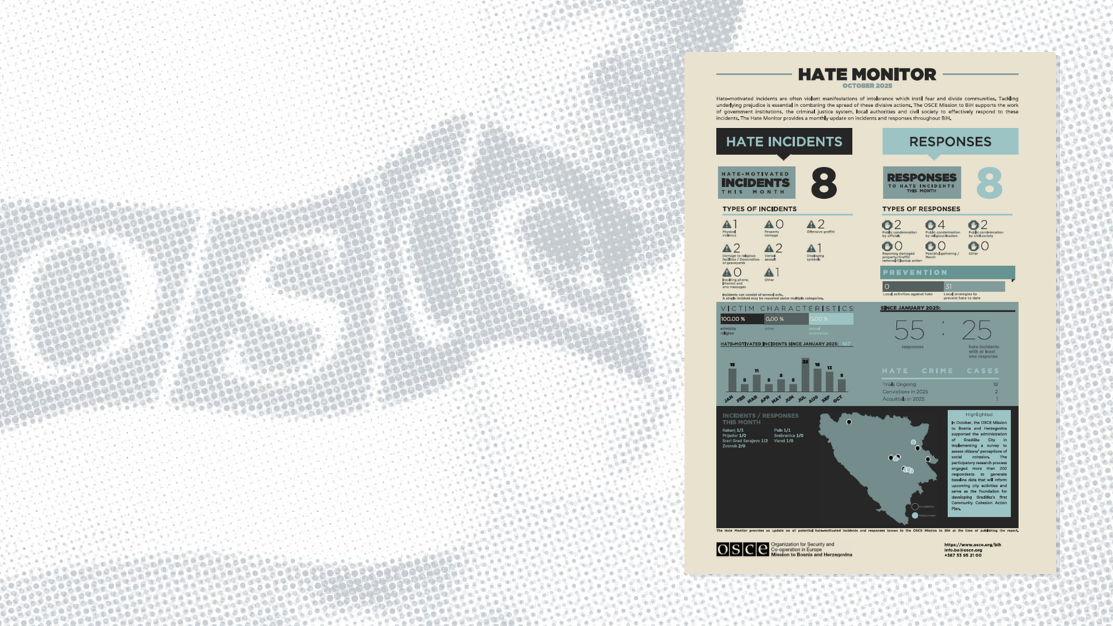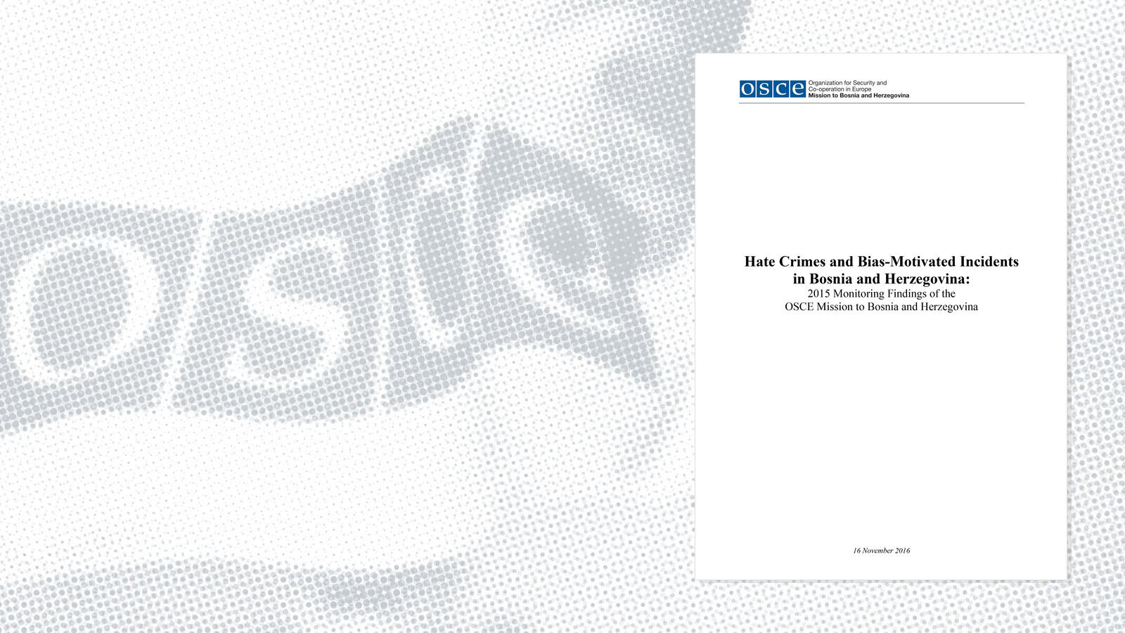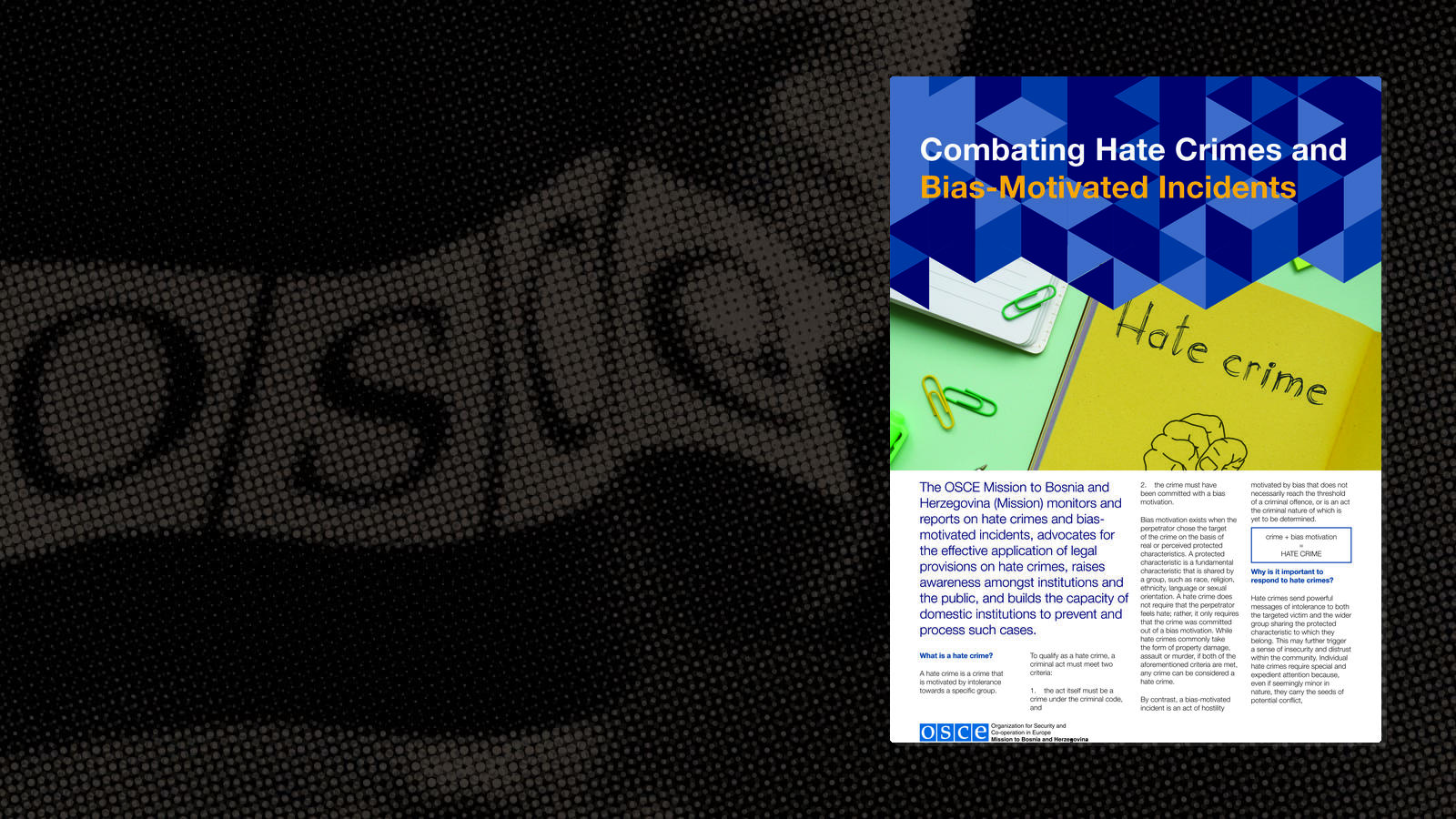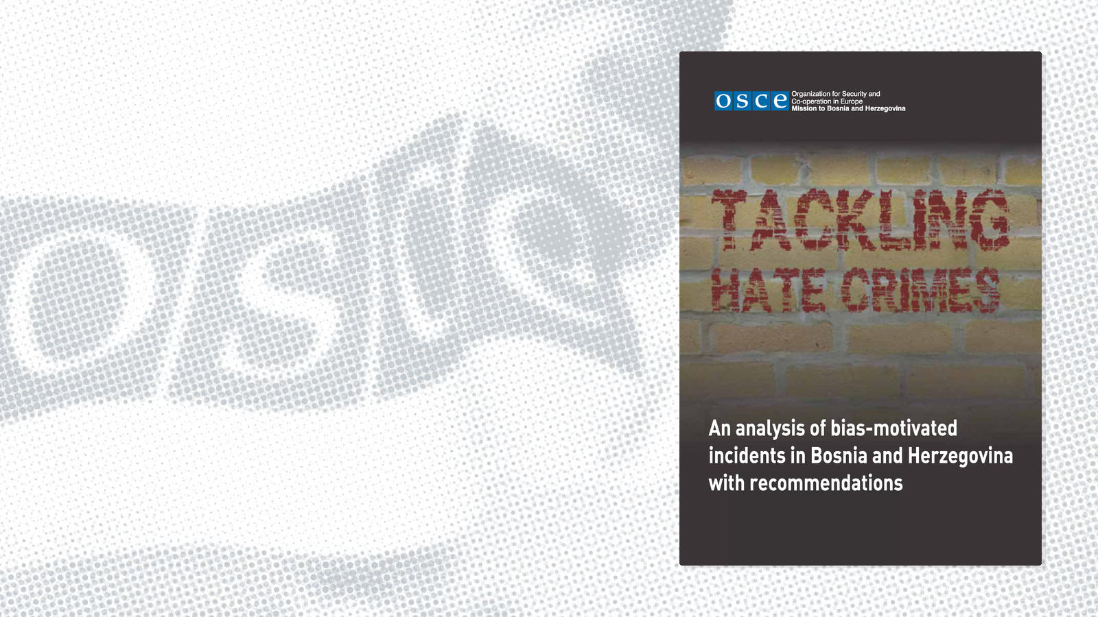 The OSCE Mission to Bosnia and Herzegovina monitors and reports on hate crimes and bias-motivated incidents, advocates for the effective application of relevant legal provisions, raises awareness, and builds the capacity of domestic institutions to prevent such crimes and process resulting cases.
