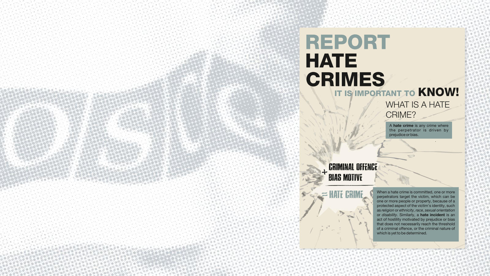 Hate crimes send powerful messages of intolerance to both the targeted victim and the wider group sharing the protected characteristic to which they belong. This may further trigger a sense of insecurity and distrust within the community. As individual hate crimes can drive potential conflict or escalate tensions, responding to them requires targeted and expedient action.