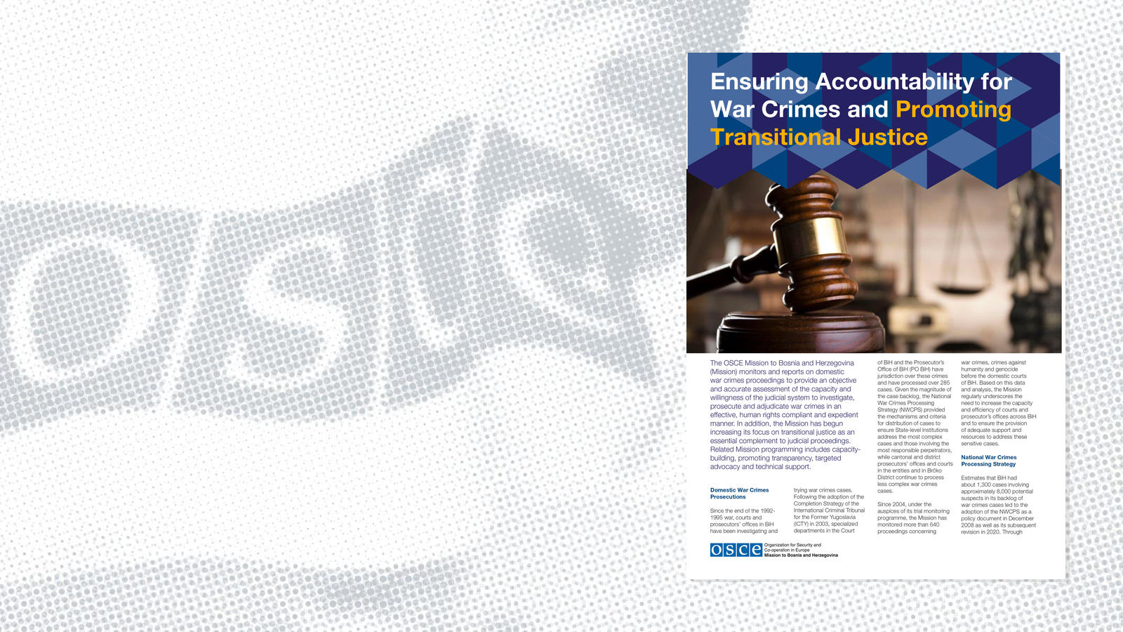 The OSCE Mission to Bosnia and Herzegovina monitors and reports on domestic war crimes proceedings to provide an objective and accurate assessment of the commitment, capacity and willingness of the judicial system to investigate, prosecute and adjudicate war crimes in an effective, human rights compliant and expedient manner. The Mission draws on these monitoring findings to identify systemic issues in the judicial response to the legacy of war and to design targeted technical assistance, capacity building, and advocacy strategies support the judiciary in addressing these issues.