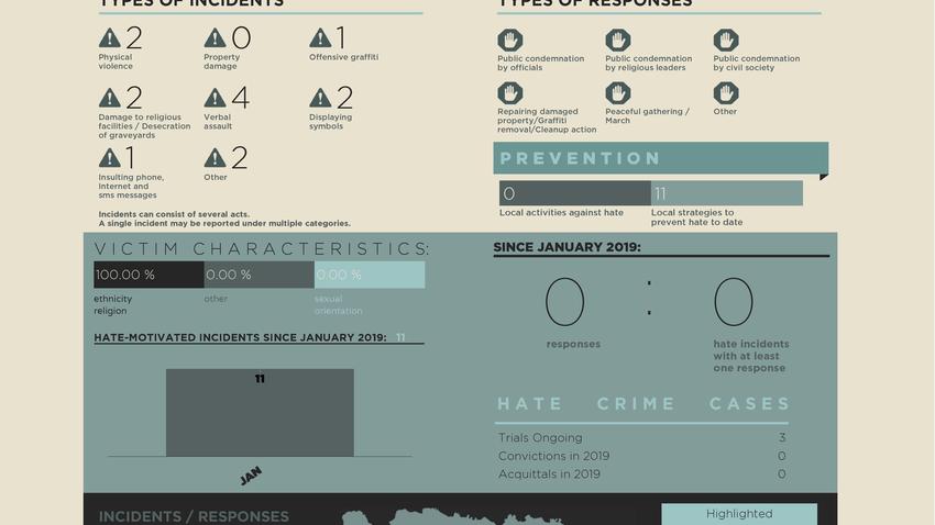 Hate-motivated incidents are often violent manifestations of intolerance which instil fear and divide communities. Tackling underlying prejudice is essential in combating the spread of these divisive actions. The OSCE Mission to Bosnia and Herzegovina supports the work of government institutions, the criminal justice system, local authorities and civil society to effectively respond to these incidents. The Hate Monitor provides a monthly update on incidents and responses throughout Bosnia and Herzegovina.