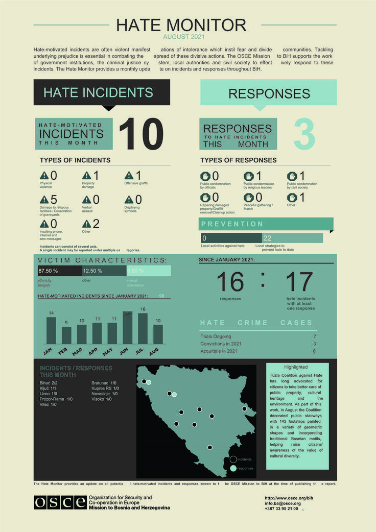 Hate-motivated incidents are often violent manifestations of intolerance, which instil fear and divide communities. Tackling underlying prejudice is essential in combating the spread of these divisive actions. The OSCE Mission to Bosnia and Herzegovina supports the work of government institutions, the criminal justice system, local authorities and civil society to effectively respond to these incidents. The 'Hate Monitor' provides a monthly update on incidents and responses throughout Bosnia and Herzegovina.