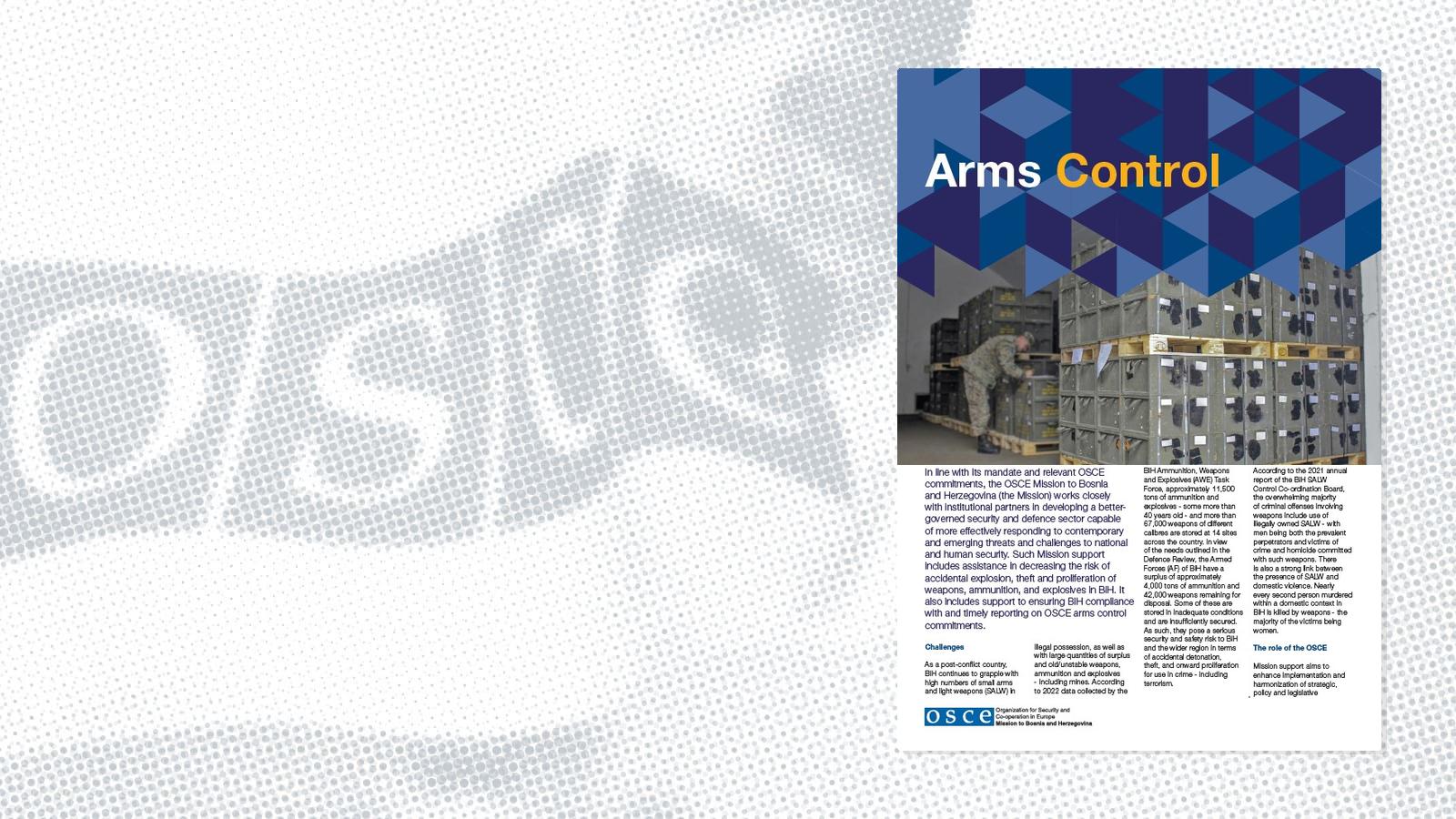 In line with its mandate and relevant OSCE commitments, the Mission works closely with institutional partners in developing a better-governed security and defence sector capable of more effectively responding to contemporary and emerging threats and challenges to national and human security. Mission support includes assistance in decreasing the risk of accidental explosion, theft and proliferation of weapons, ammunition and explosives in Bosnia and Herzegovina. It also includes support to ensuring the country’s compliance with and timely reporting on OSCE arms control commitments.
